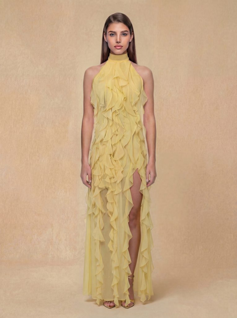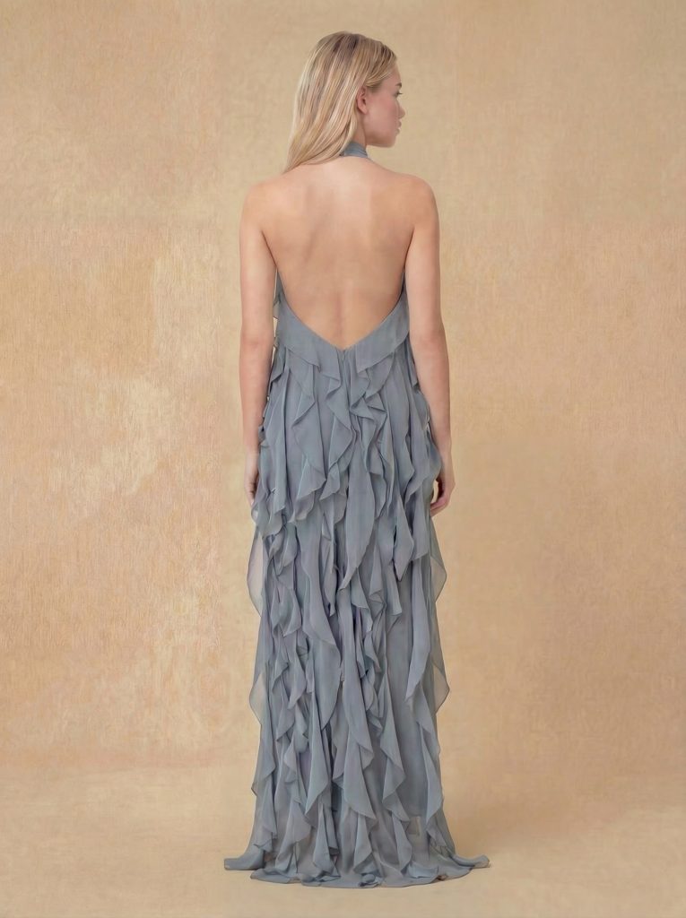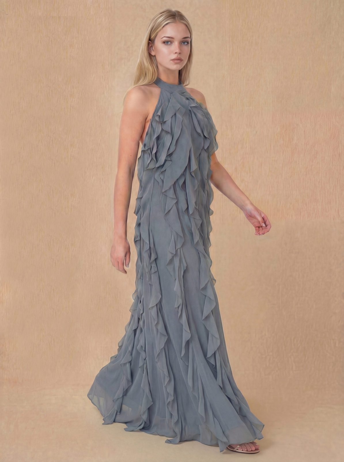 Make a statement with the Belle dress, where delicate femininity meets contemporary sophistication. Its flowing ruffle layers cascade gracefully from top to hem, creating a dramatic silhouette that moves beautifully with every step.